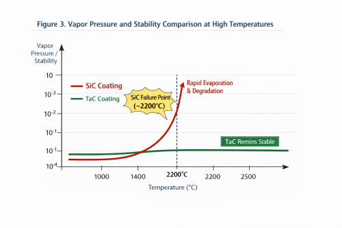 မယှဉ်နိုင်သော အပူချိန်တည်ငြိမ်မှု- Tantalum Carbide (TaC) သည် အံ့မခန်း အရည်ပျော်မှတ် 3880°C ရှိသည်။ Journal of Crystal Growth မှ သုတေသနပြုချက်အရ SiC အပေါ်ယံပိုင်းသည် 2200°C ထက်တွင် "ကွဲလွဲသောရေငွေ့ပျံခြင်း" ကိုကြုံတွေ့ရပြီး - silicon sublimation သည် ကာဗွန်ထက်ပိုမိုမြန်ဆန်စေပြီး structural degradation နှင့် particles များကိုညစ်ညမ်းစေပါသည်။ ဆန့်ကျင်ဘက်အားဖြင့် TaC ၏အငွေ့ဖိအားသည် 3 မှ 4 ဖြစ်သည်။SiC ထက်နိမ့်သော ပြင်းအား အမှာစာများ ၊ ကျောက်သလင်း ကြီးထွားမှုအတွက် သမရိုးကျ အပူစက်ကွင်းကို ထိန်းသိမ်းထားသည်။